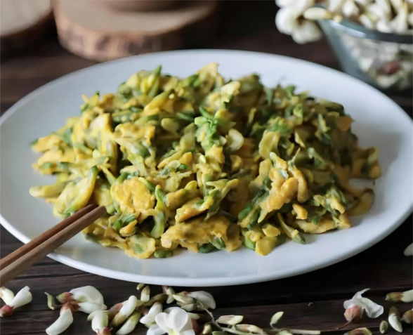 鲜槐花洗净,放入开水锅中焯一下,沥净水后,加入鸡蛋液搅匀,入锅炒至块状。槐花炒蛋是一道美味可口的名菜,口味嫩香可口,有补气凉血的功效。