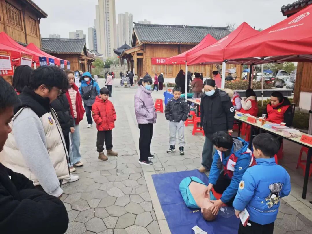招聘会现场人头攒动,气氛热烈。前来咨询的求职者络绎不绝。群团部门设立了服务台提供便民服务,如劳动维权咨询、免费检查眼部健康、科普急救知识等。