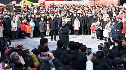 总书记察看街区风貌和各式年货摊位,同现场群众亲切交流。他愉快地向大家讲起年少时多次到隆福寺的情景,还购买了特色食品和文创产品。