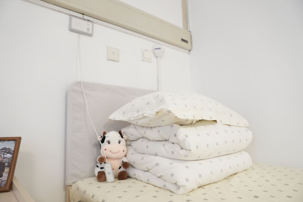 银龄老年公寓的床位旁,都配有对讲装置(2月10日摄)。