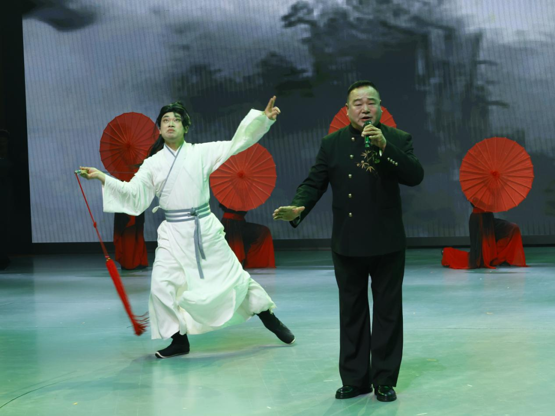 潮涌大江,携千里长风漫过浠水沃野,与蜿蜒的浠水河相拥共生,滋养着这方藏着千年文脉的土地。杂技《丝路花语--绸吊》可谓是惊艳全场,将柔美与力量完美相融,演员于高空之上如灵猴般倒挂、旋转、攀升,每一个动作都行云流水、一气呵成,引得在场观众阵阵拍手叫好,将现场的暖意与欢喜推向高处。浠水杂技,历经几代人的坚守与耕耘,终成今日之光彩,愿它能成为浠水大地上又一段赓续千年的文脉传奇。歌曲《江湖夜雨十年灯》婉转登场,江湖夜雨,十年灯影,一唱便是岁月悠长。舞台之上,更有我在抖音中时常刷到的浠水伢,楚剧演员范彬斌为其伴舞,一手提酒壶,一手执长剑,白衣飘飘,英姿飒爽,将江湖儿女的侠骨柔情演绎得淋漓尽致,让我忍不住一次次将镜头定格在他身上。