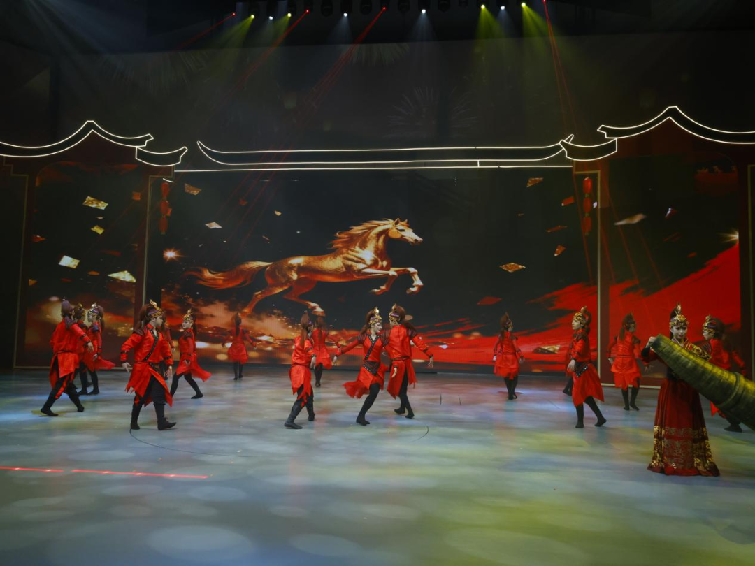 开场序曲以精湛杂技《龙狮闹春》和火热舞蹈《骏马迎春》拉开晚会帷幕。只见金龙腾跃翻飞,身姿盘旋若云卷云舒;雄狮抖擞鬃毛,气势磅礴似烈火燎原;舞蹈背后的电子大屏上,光影流转间,骏马踏风而来,踏过光影,踏过新春的晨曦,也踏向浠川的新岁。