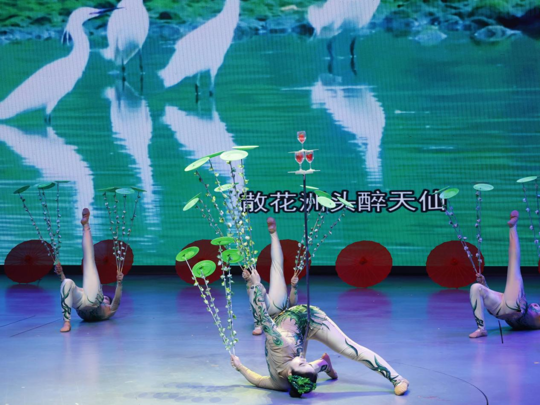 就在我们大家还沉浸在《绸吊》的余韵里,尾声的旋律已缓缓漫开,结尾曲依旧是杂技歌舞《中国有个浠水县--转蝶》,身着绿白相间表演服的演员们,携着浠水的灵秀,从山水间翩跹而来。我也抓拍到了一张自己颇为满意的照片:演员以后脑与侧肩着地,臀部微微上翘,身体舒展成一道优美而极具张力的弧线。她口中衔着一根长钢管,钢管顶端的小平台上,稳稳叠放着三杯红酒,酒杯稳稳悬于空中,不见半分摇晃,那极致的定力与柔婉,令人惊叹。此刻,电子大屏上恰好浮现出“散花洲头本醉天仙”的歌词,情景相融,相映成趣。