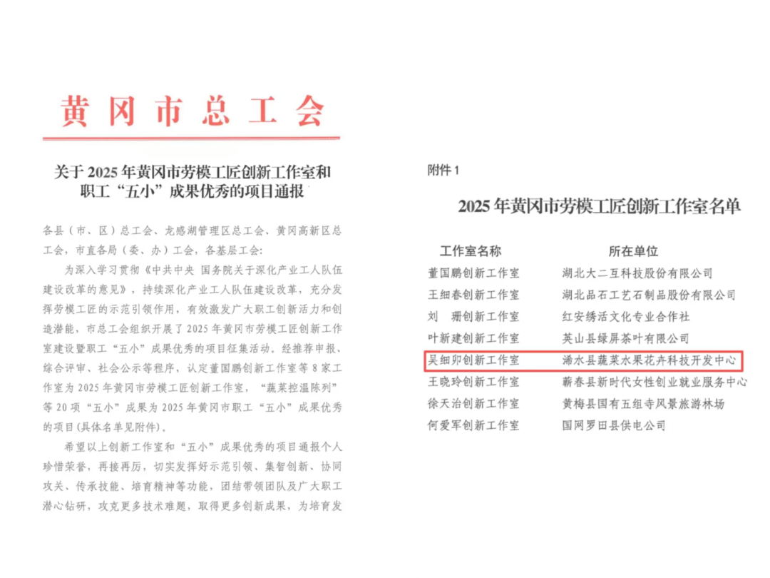 近日,市总工会通报公示了2025年黄冈市劳模工匠创新工作室建设暨职工“五小”成果优秀的项目征集活动结果。经推荐申报、综合评审、社会公示等程序,县农业农村局蔬菜水果花卉科技开发中心吴细卯劳模工作室被认定为2025年黄冈市劳模工匠创新工作室。